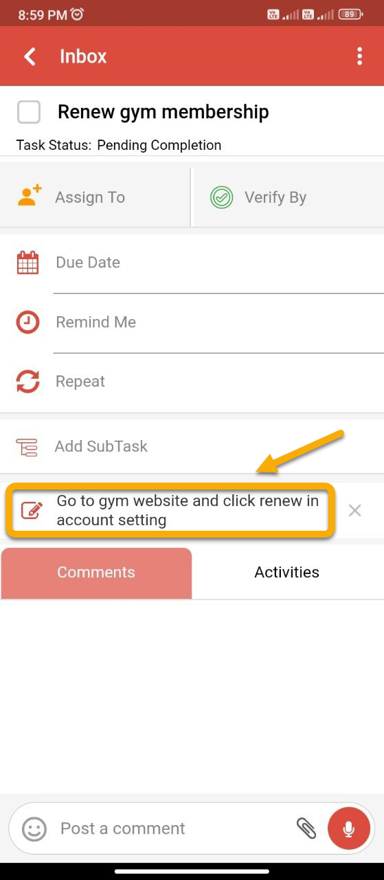 How to add a task description or note to an existing task